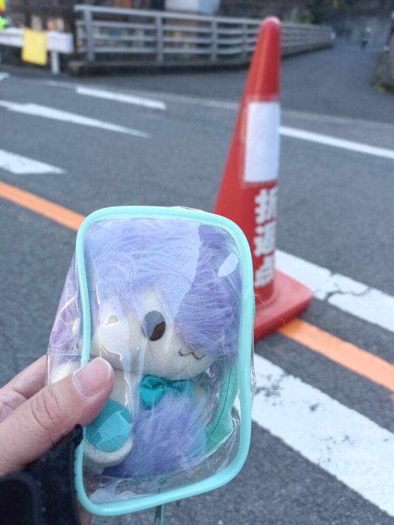 ここでポシェットからスマホとぬいぐるみを取り出し、