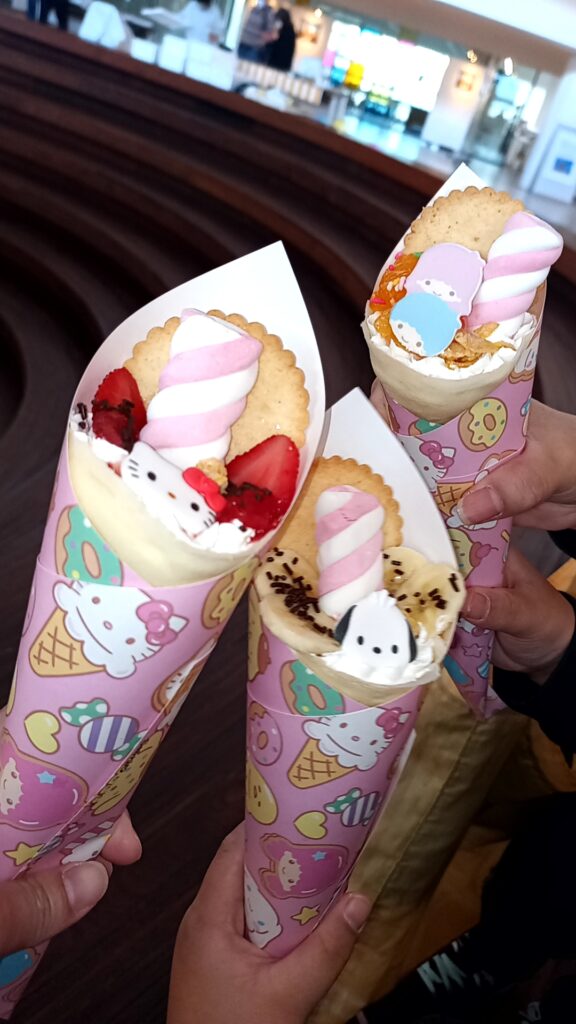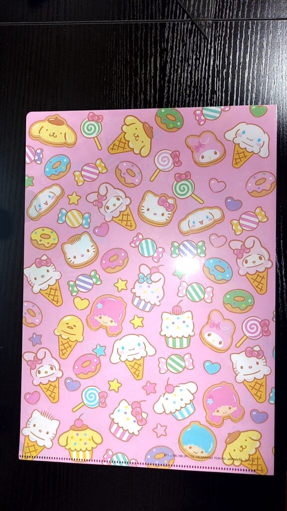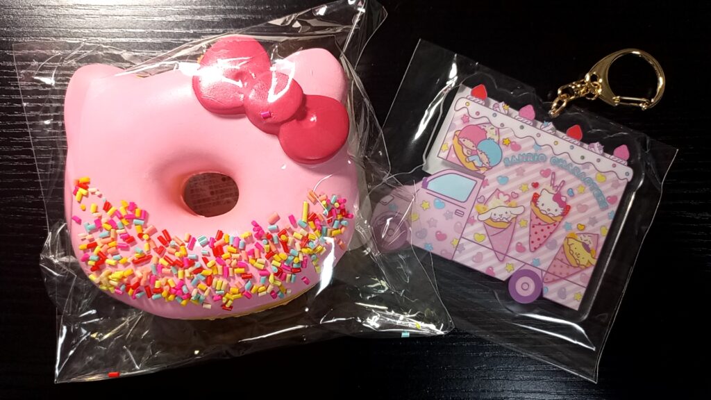 私はキティちゃんのドーナツ型キーホルダーと、クレープ号デザインのキーホルダー、そしてスイーツ柄のクリアファイルを購入。
