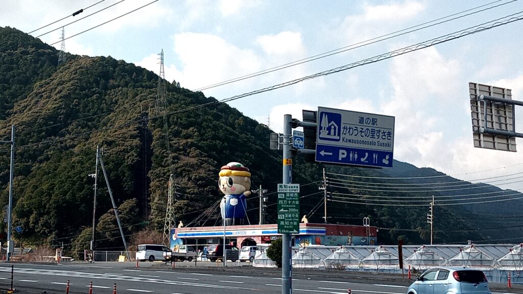 道の駅の反対側のコンビニ。かなり目立つしんじょう君のバルーン。